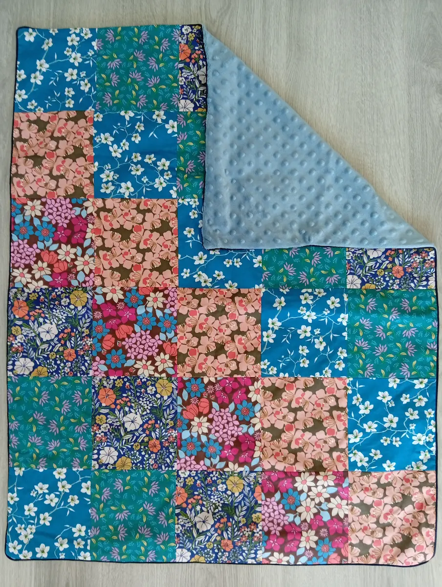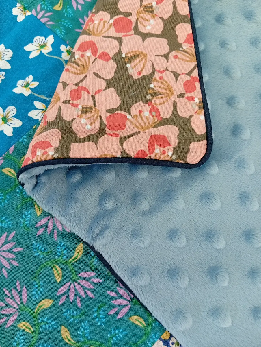 Coloris : Patchwork multicolore fleuri / Minky bleu-gris perle. Lisière pour le contour bleu marine.