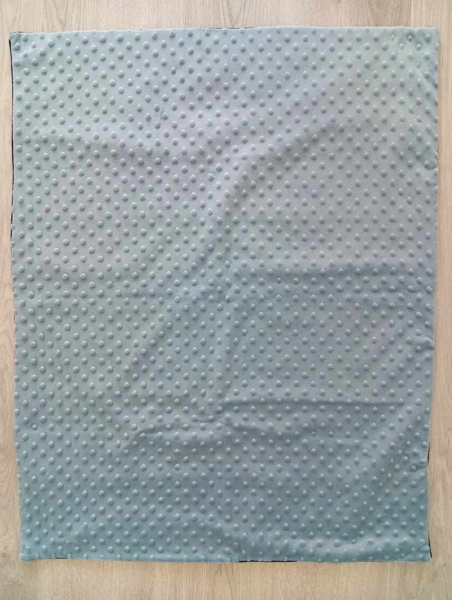 - Une face en minky gaufré bleu-gris (100% polyester), une matière « doudou » ultra-moelleuse qui rassure bébé.