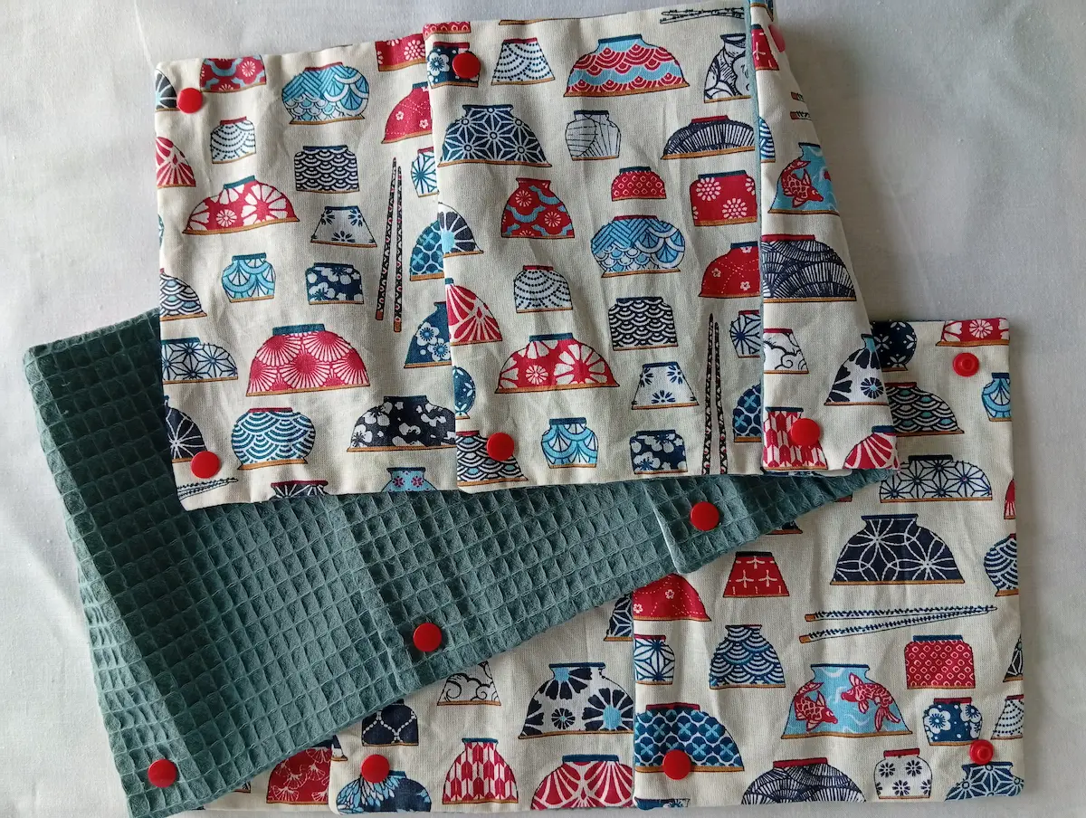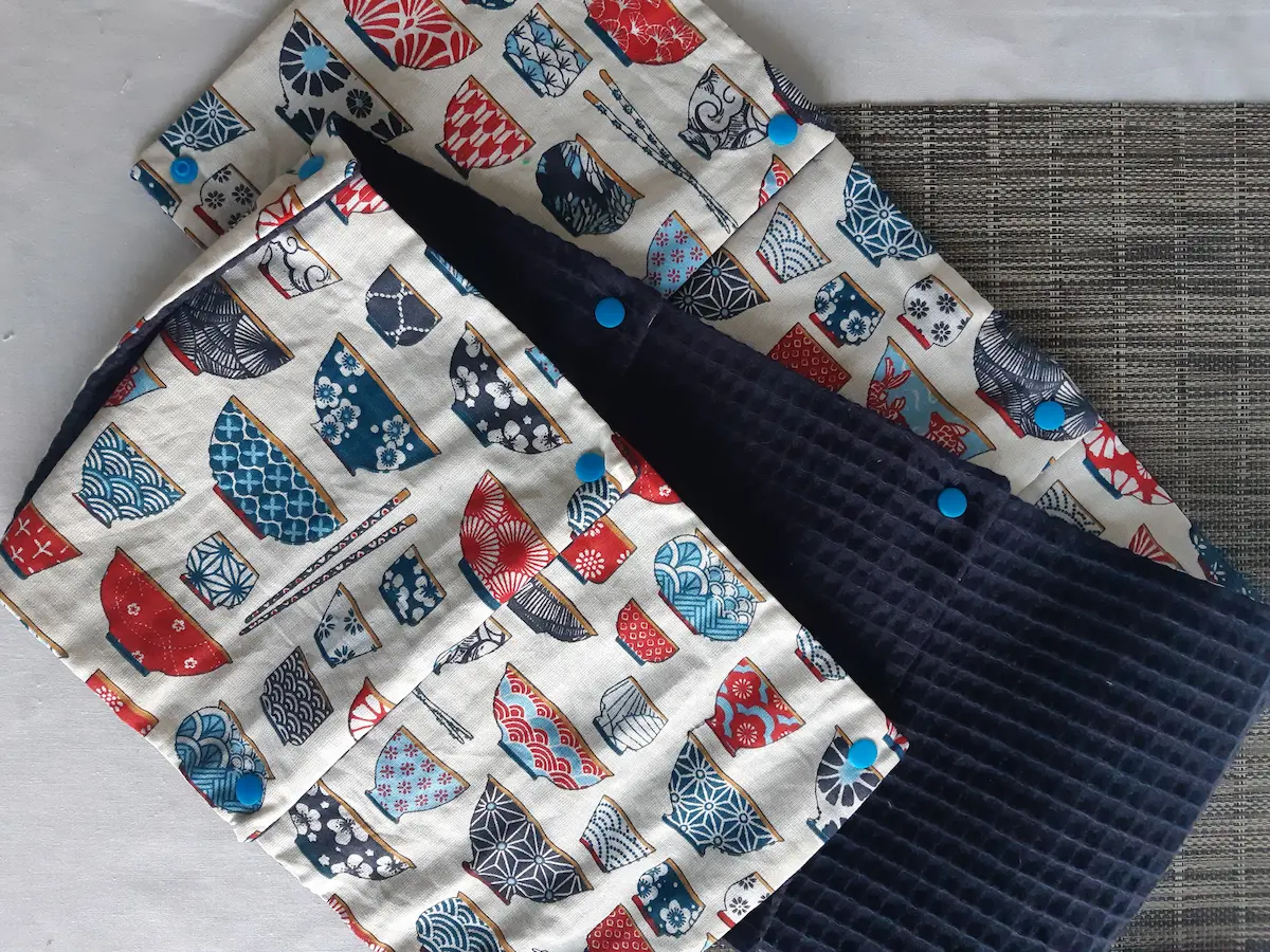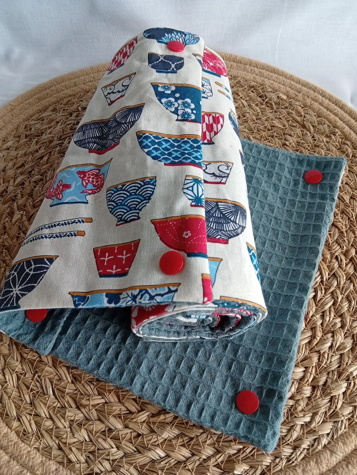 Composition : Coton certifié Oeko-Tex (motif Ramen japonais) et éponge absorbante de qualité supérieure.