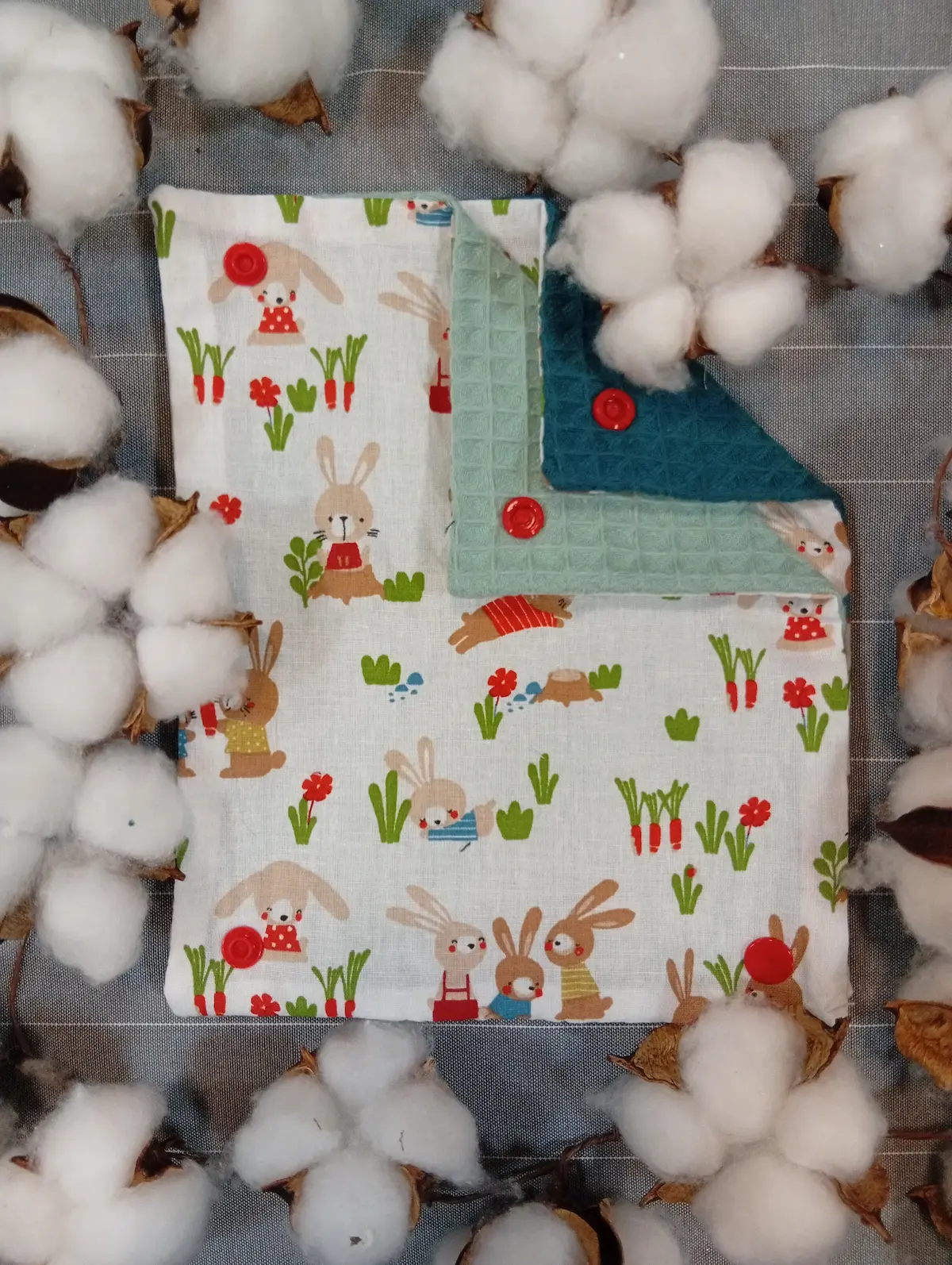 • L’action : Une face en éponge nid d’abeille ultra-absorbante, disponible en bleu ciel ou bleu canard selon vos envies. Le nid d’abeille est idéal car il gratte légèrement les taches sans rayer et sèche très vite !
