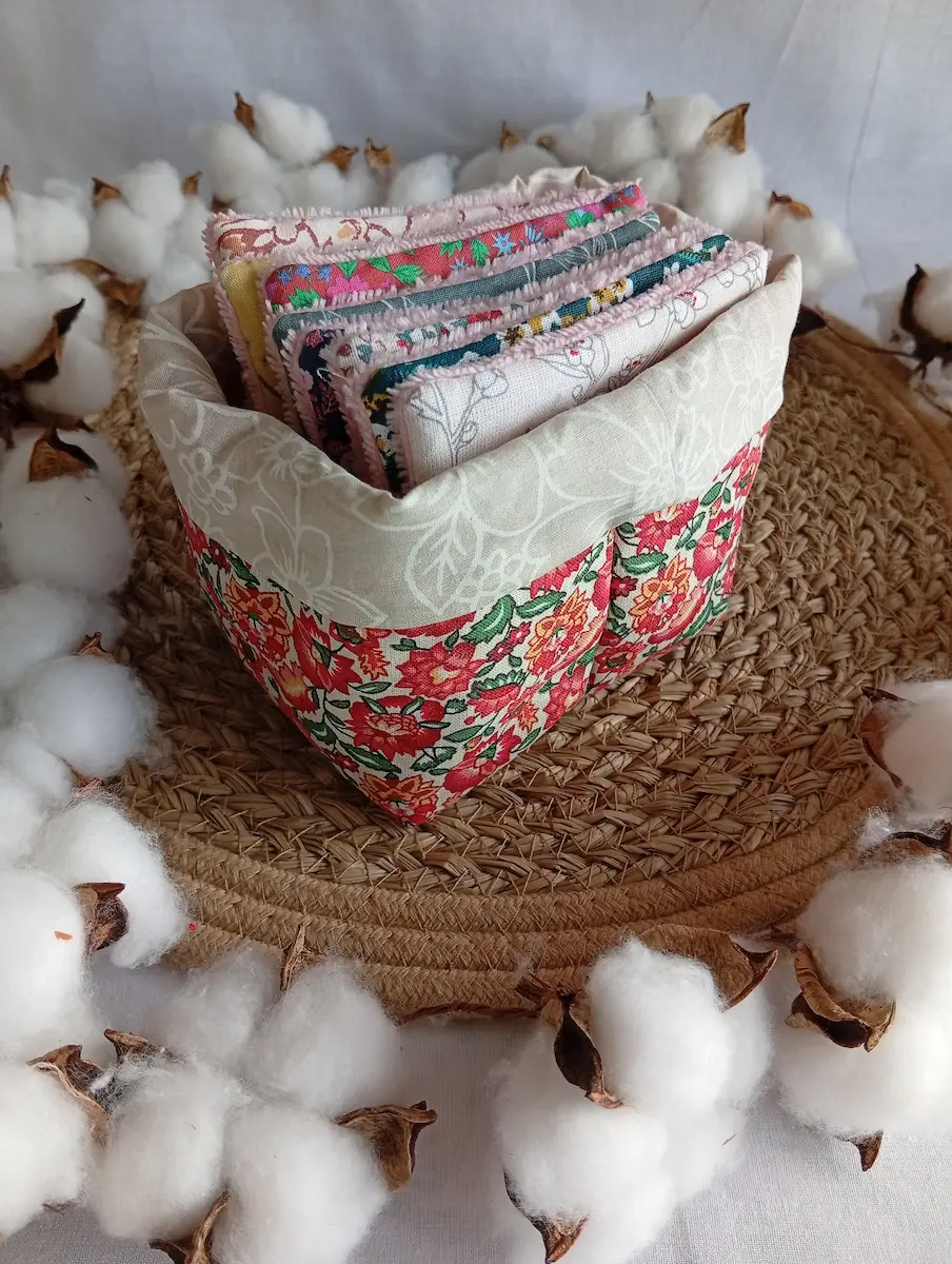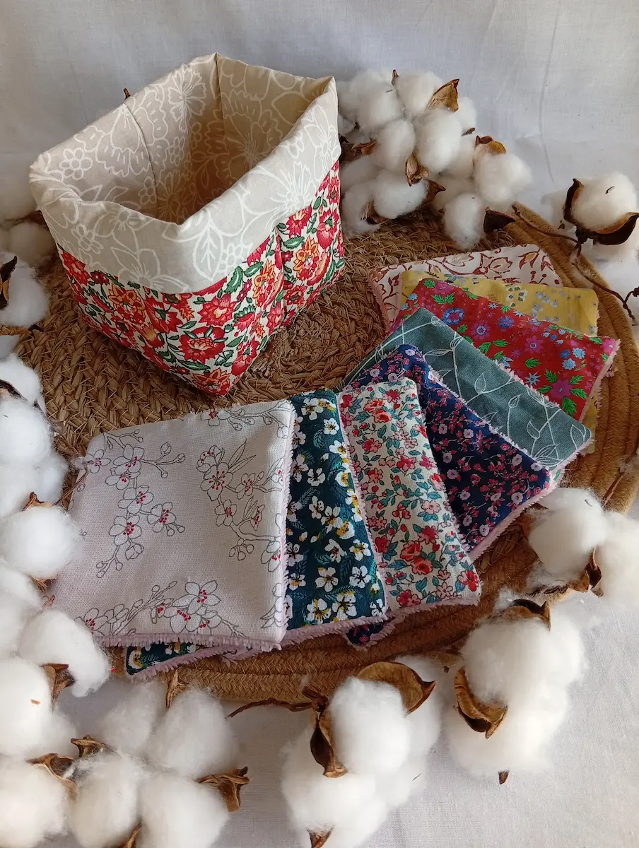 Panier et 8 lingettes lavable bambou fleurs aux motifs colorés et variés. Chaque lingette est un carré de 10 cm de coté.
