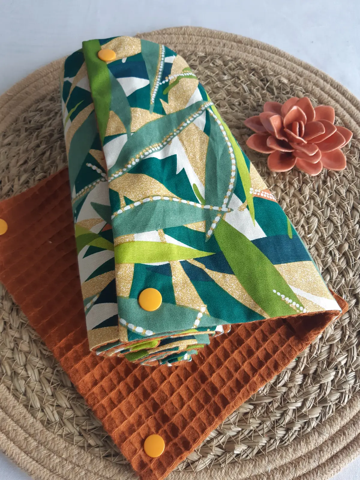 Serviette de table peu chère, mais de qualité. La matière en coton la rend trés douce au touché, et les couleurs sont lumineuses. Un grand merci à l’artisan pour cette belle création
