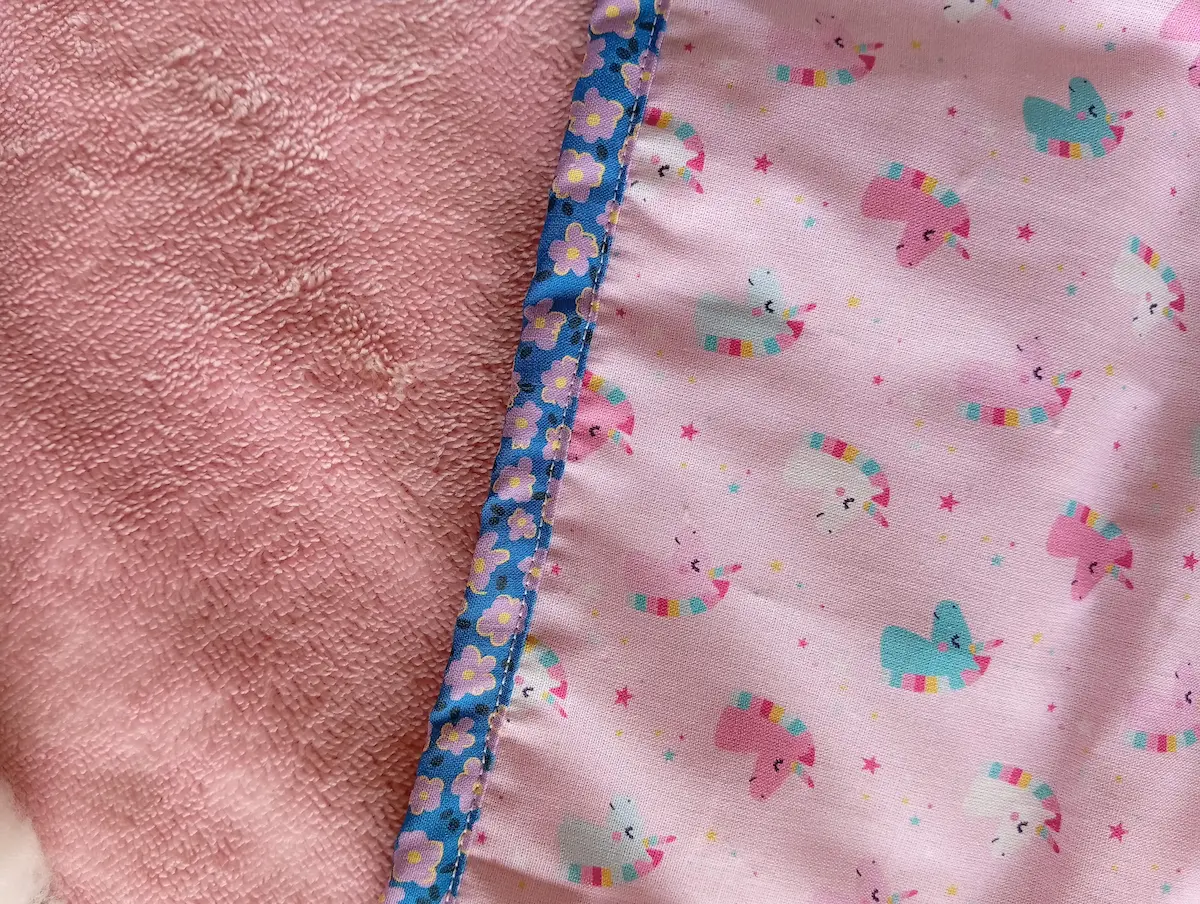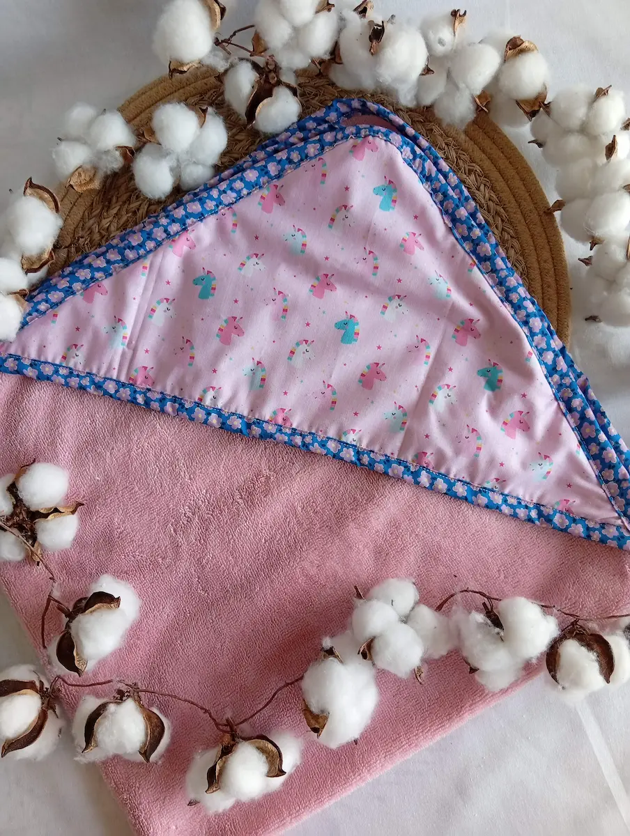 Finitons soignées : Le biais, qui encadre délicatement la capuche et le tour de la cape, est également 100% coton. Son motif de fleurs mauves et jaunes sur fond bleu réhausse l’univers licorne. 🎉